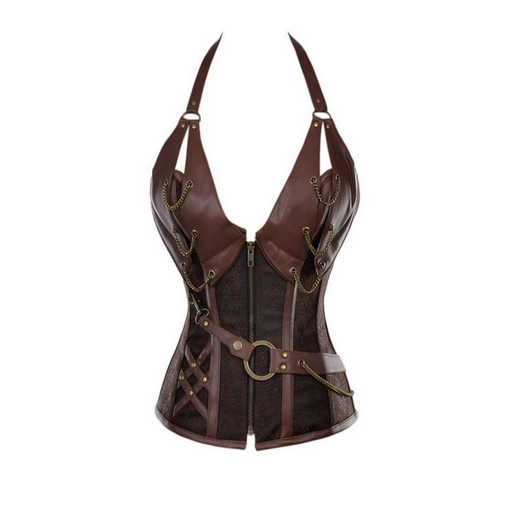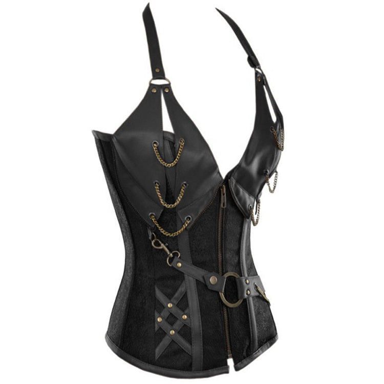 Key features: • Halterneck, chain embellishment, firm compression • PU faux leather • Zipper for precision fit • Ribbon criss-cross adjustable lacing • Hand-wash only